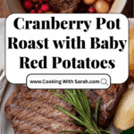 This Cranberry Pot Roast is a deliciously tender and flavorful beef chuck roast cooked slowly with fresh cranberries, cranberry sauce, baby red potatoes, garlic, and rosemary. The combination of savory roast and tart cranberries makes a perfect American-style dinner that’s both hearty and festive.