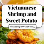 Vietnamese Shrimp and Sweet Potato Fritters, known as Banh Tom, are crispy, golden fritters made with sweet potato matchsticks and marinated shrimp coated in a light turmeric batter. Double-fried for extra crunch, these savory snacks are served with fresh herbs and traditional Vietnamese dipping sauce (nuoc cham) for an authentic and delicious appetizer or side dish.